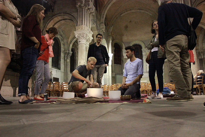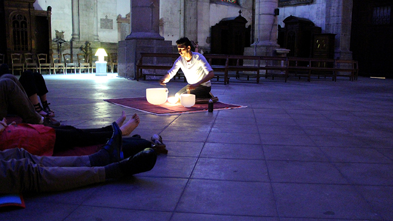 Les auditeurs sont assis ou allongés en cercle, au centre de la nef. Leur champ visuel s’ouvre sur les voûtes illuminées…